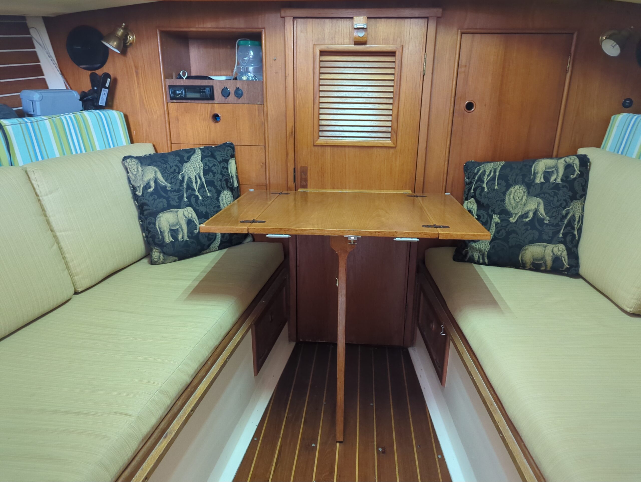 Both the NS26C and NS30C have a large table in the saloon. Great table, storage for wine bottles or whatever, fold out wings, thumb screws to hold it in place. The issue is BIG. It dominates the saloon. After several false starts and iterations, I finally have a table that works and leaves the saloon open.