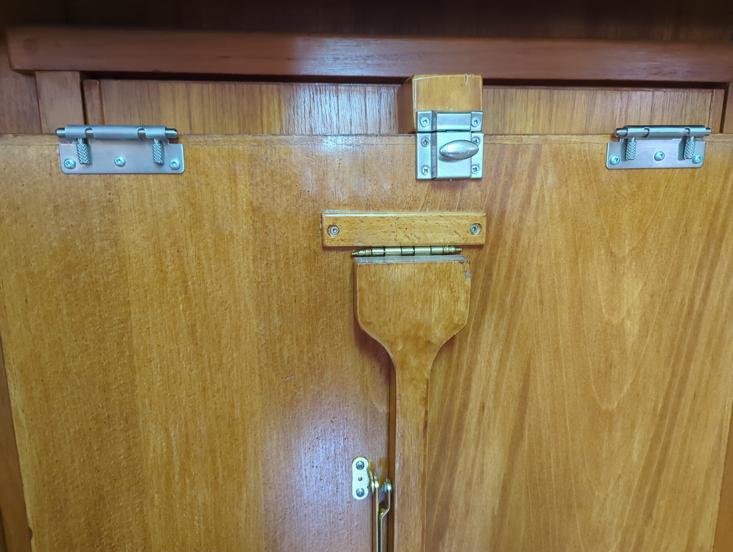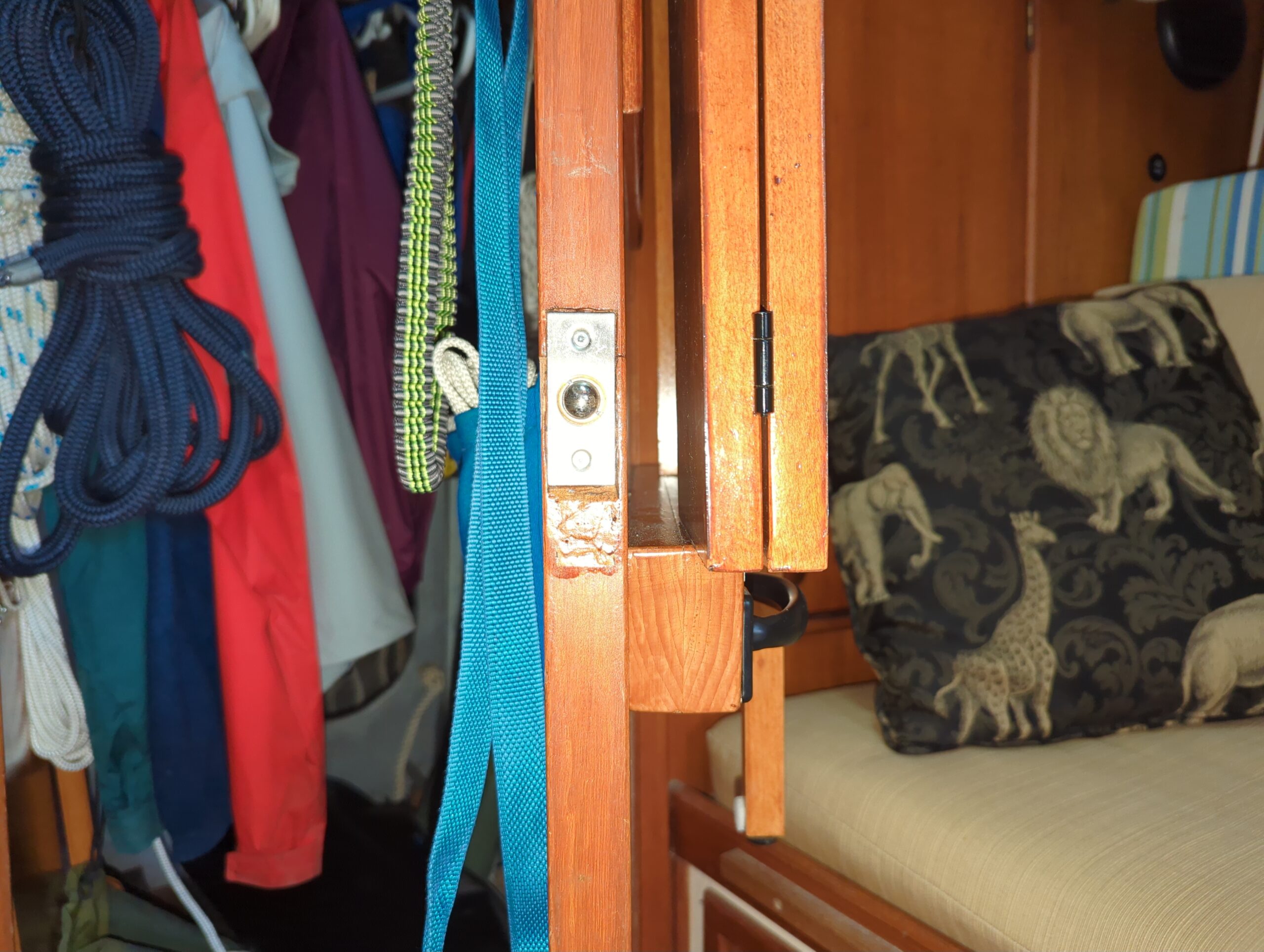 A rectangular wood bar is attached to the door, screwed through the door’s internal frame. A piano hinge is attached to the bar and the table. Above the table, screwed through the door, is wood holding the catch. The leg is screwed to the underside of the door with a hinge, a magnet embedded in the door attracts a screw in the leg, keeping the leg from moving as the boat bounces around. If you really want to, have two legs in case someone leans on the table to stand up, however watch there is room to get feet in. Because the table covers the door handle, replace it with a ball catch and grab handle (black in pics below). Full plans in PDF format are available here.